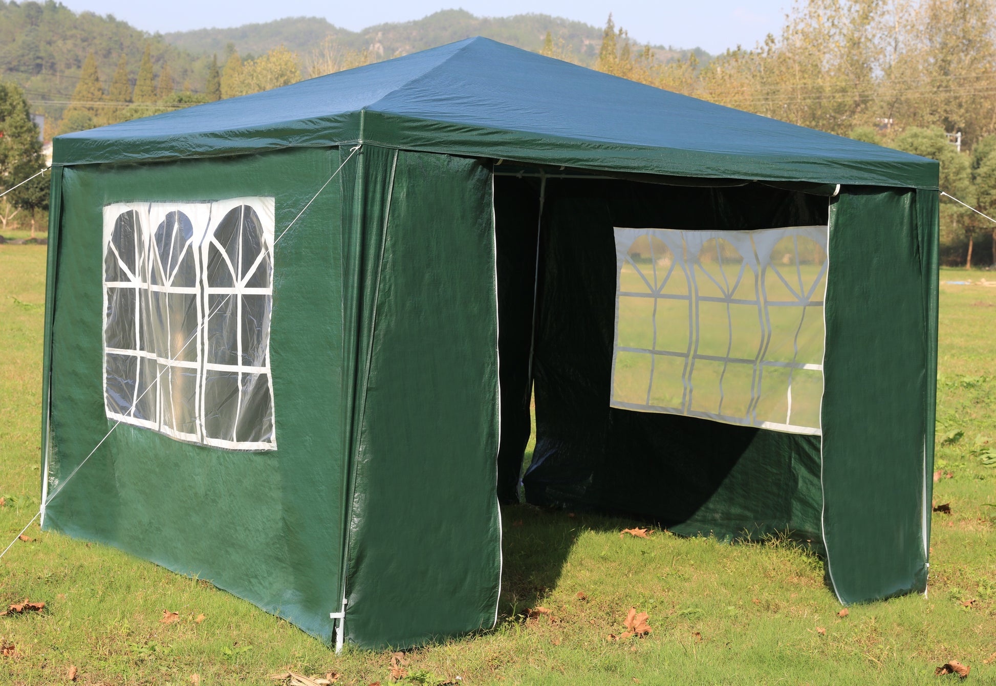 Featuring a thick steel frame and extra heavy-duty cloth material, the 3 x 3m Gazebo - Green, is built to last, and designed to withstand most any weather condition. Beyond the classic tent design, 4 walls are included - for added privacy, shade, and protection from the elements. These walls may be rolled up in order to suit your custom needs. The 3 x 3m Gazebo - Green, has the large dimensions, sturdy construction, and versatile wall features you need to beat the heat and make your next outdoor event a special one.