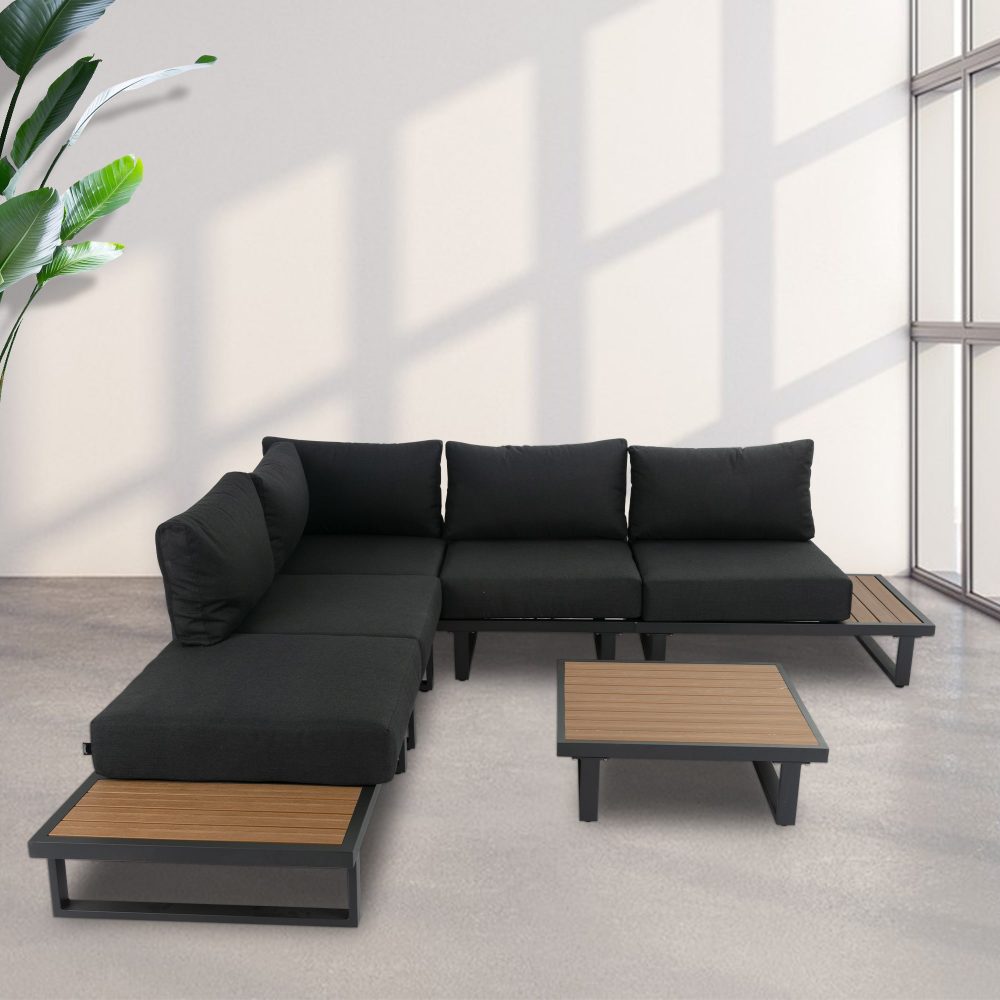 Spend cosy time with friends and family as you relax in your garden or patio. This lounge set accommodates five people, it comes with a square slatted polywood coffee table and 2 built-in side tables, where you can place drinks and snacks, or decorative items.