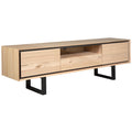 Give the real lively feel to your living area with this amazing TV unit. The unit has 2 doors covering 4 compartments, 1 niche with a cable hole and 1 drawer with full extension metal runners. The TV unit is made of sustainably harvested, MDF Veneer Messmate, Solid Rubber and Kiri Wood. The combination makes the furniture piece super strong, and durable. All doors and drawer fronts are made from solid messmate. The drawer boxes are made from Kiri wood with a finger joint construction and a messmate veneer base. All doors and drawers have integrated handles for a clean seamless look. Black shadow gap around the doors and drawers add to the ETU's beauty. Painted in a natural PU finish, the ETU is paired with black powder coated metal leg frame. The elegant TV unit has a one-of-a-kind design with top and legs in different colours and styles. A one-year warranty is included with the easy-to-assemble TV unit.
