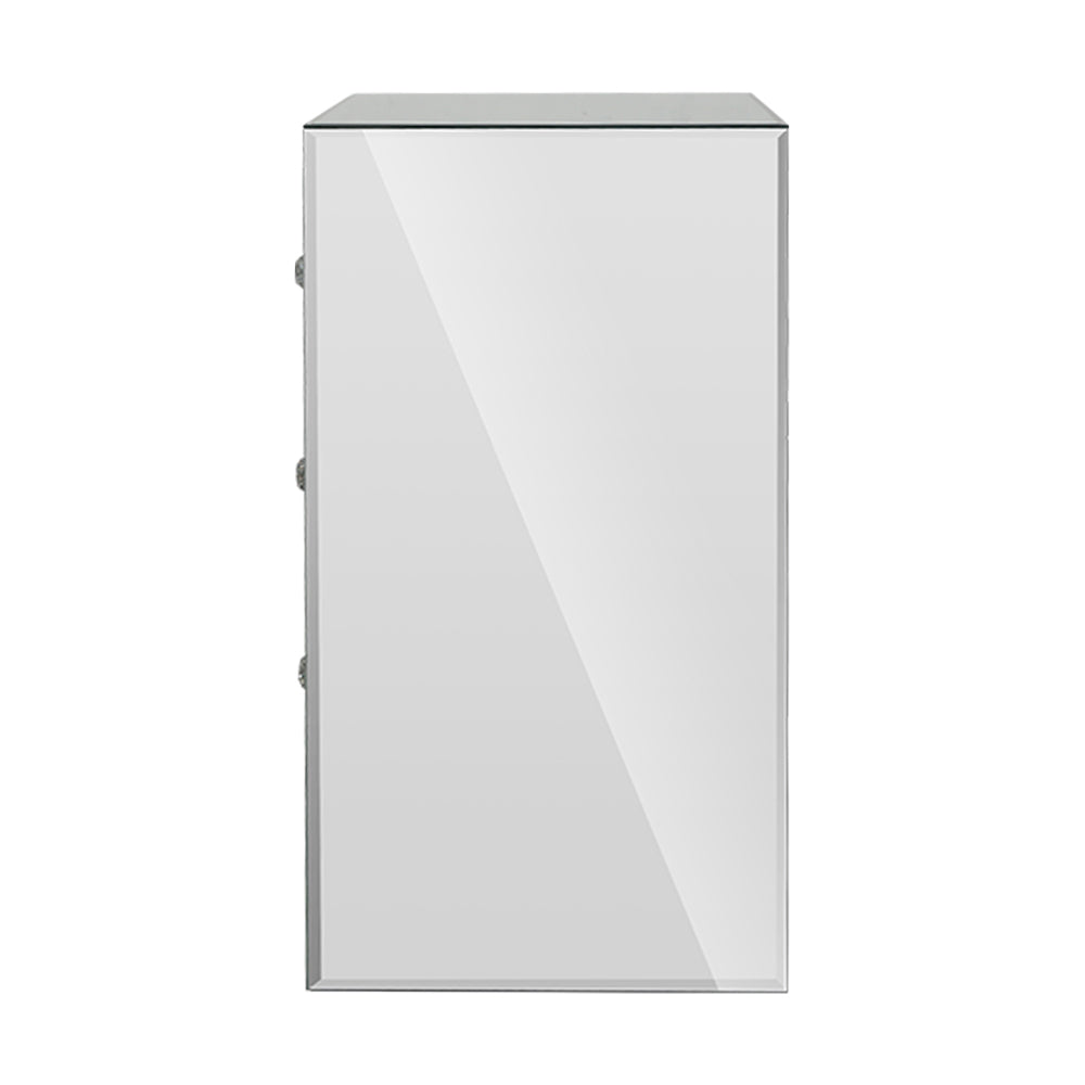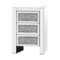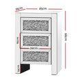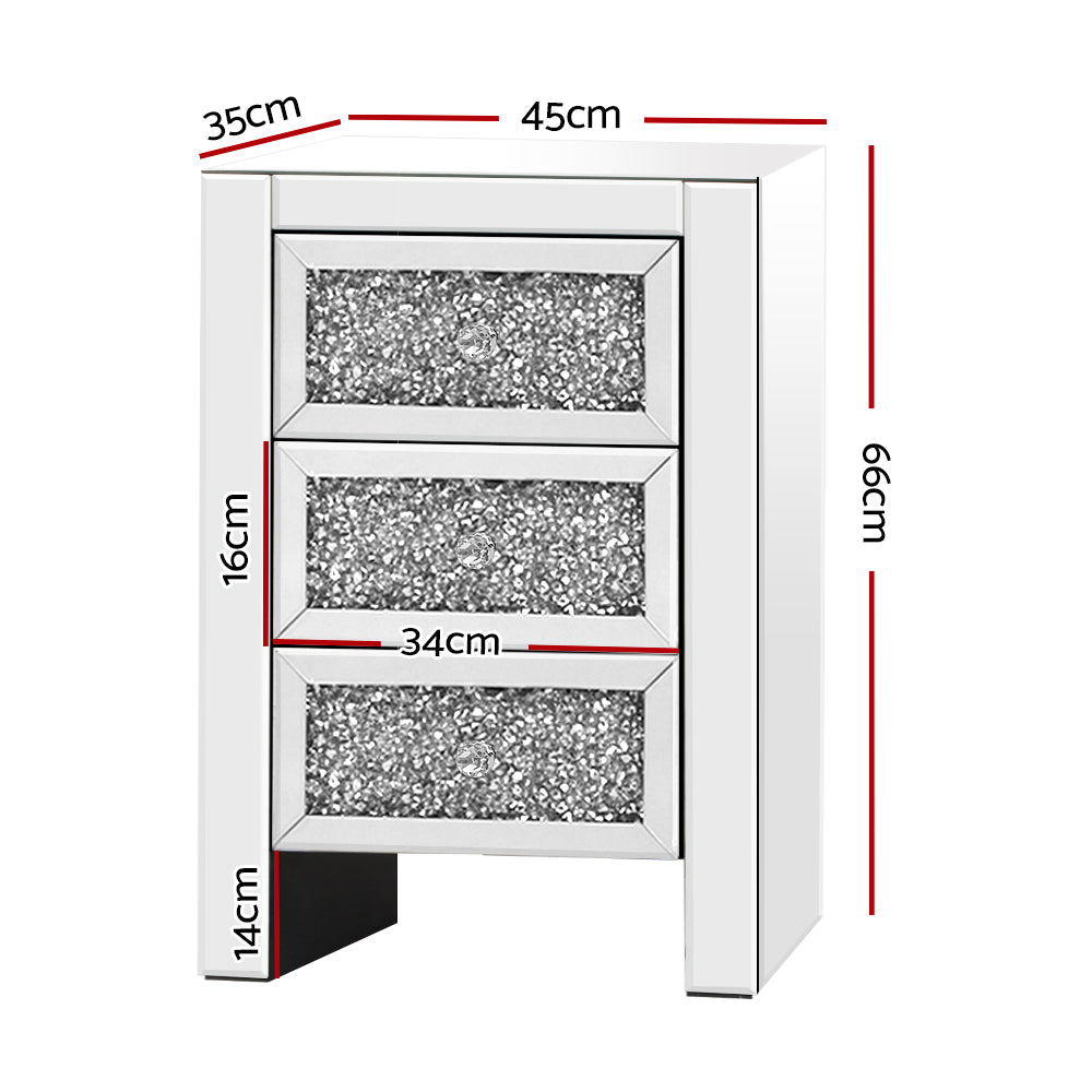 Enjoy all the glitz and glamour that comes with our Artiss Diamond Mirror Bedside Table. Cladded with brilliant bevelled mirror glass and a durable E1-grade MDF frame, the elegant bedside table is simply stunning from any angle that reflects its mirrored beauty. Place it in your bedroom or even in the living room, study or any other room that needs some extra storage with some pizzazz. Wherever you place it, the mirrored effect gives the room a larger-than-life look of space and size. The three drawers offer ample storage space and have well-fitting tenon runners for smooth operation. Not least, the unique drawer fronts and crystal glass effect knob handles also add some scintillating touches to the drawers with an exquisite appeal. Easy to maintain and clean, our bedside table is all about grandeur living made simple.