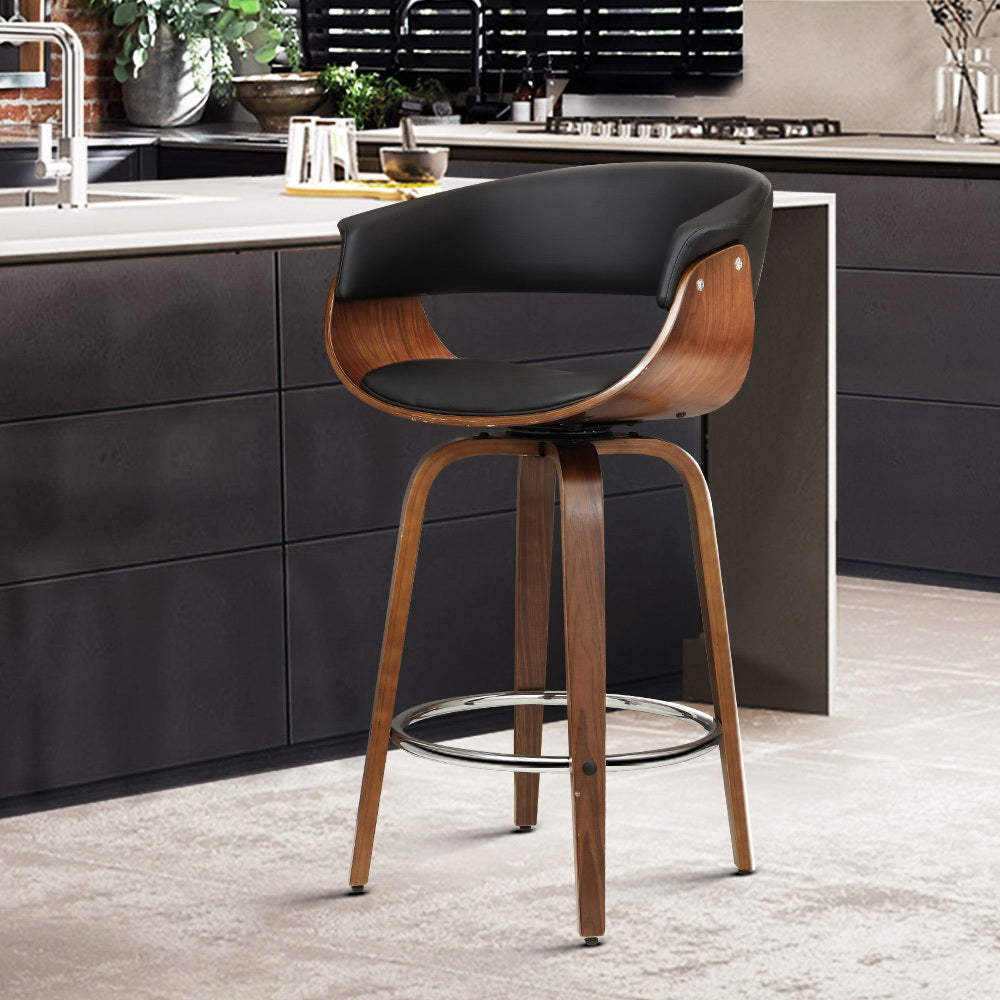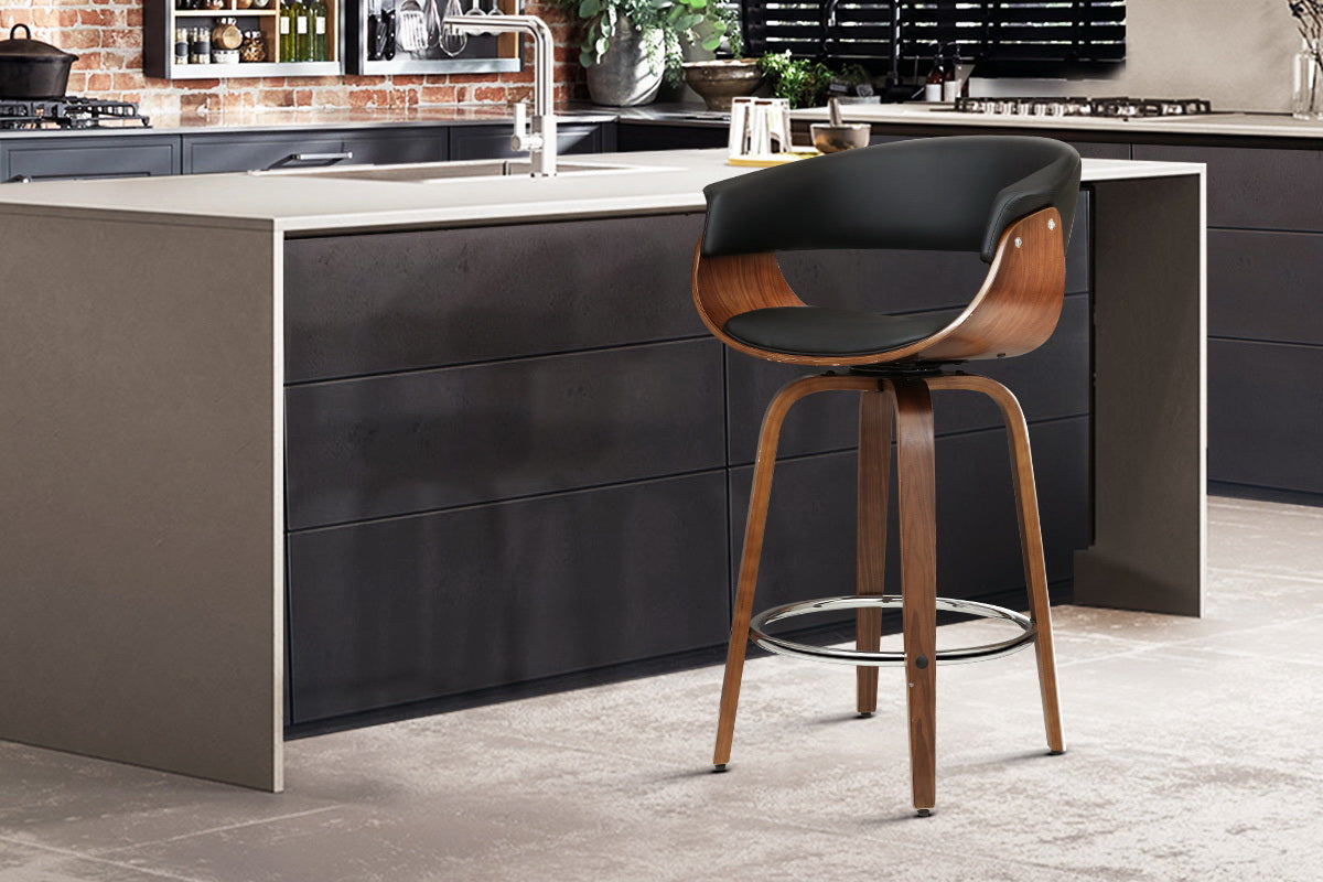 Wood, metal and deluxe PU leather in total harmony to create a luxe feel. Meticulously crafted with solid plywood with a stunning walnut finish for the frame, the bar stool features a thick padded faux leather seat that rotates fully, a mid-height backrest which provides ample support while the anti-slip floor protectors at the bottom of the legs ensure no scratches are left on the floor.