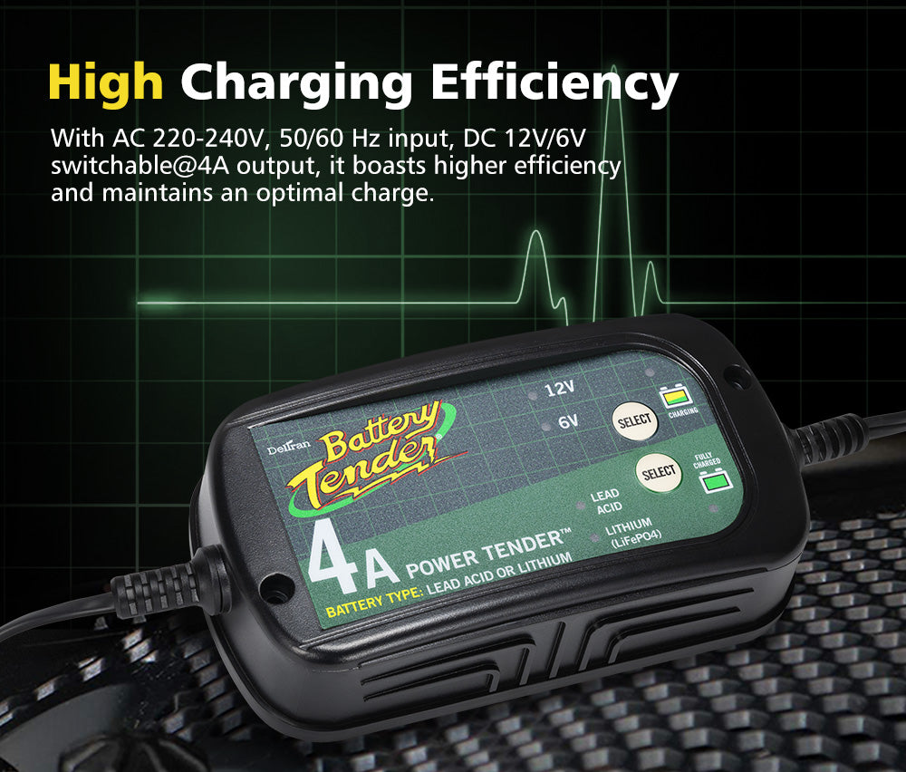 High Charging Efficiency: With AC 220-240V, 50/60 Hz input, DC 12V/6V switchable@4A output, it boasts higher efficiency and maintains an optimal charge.