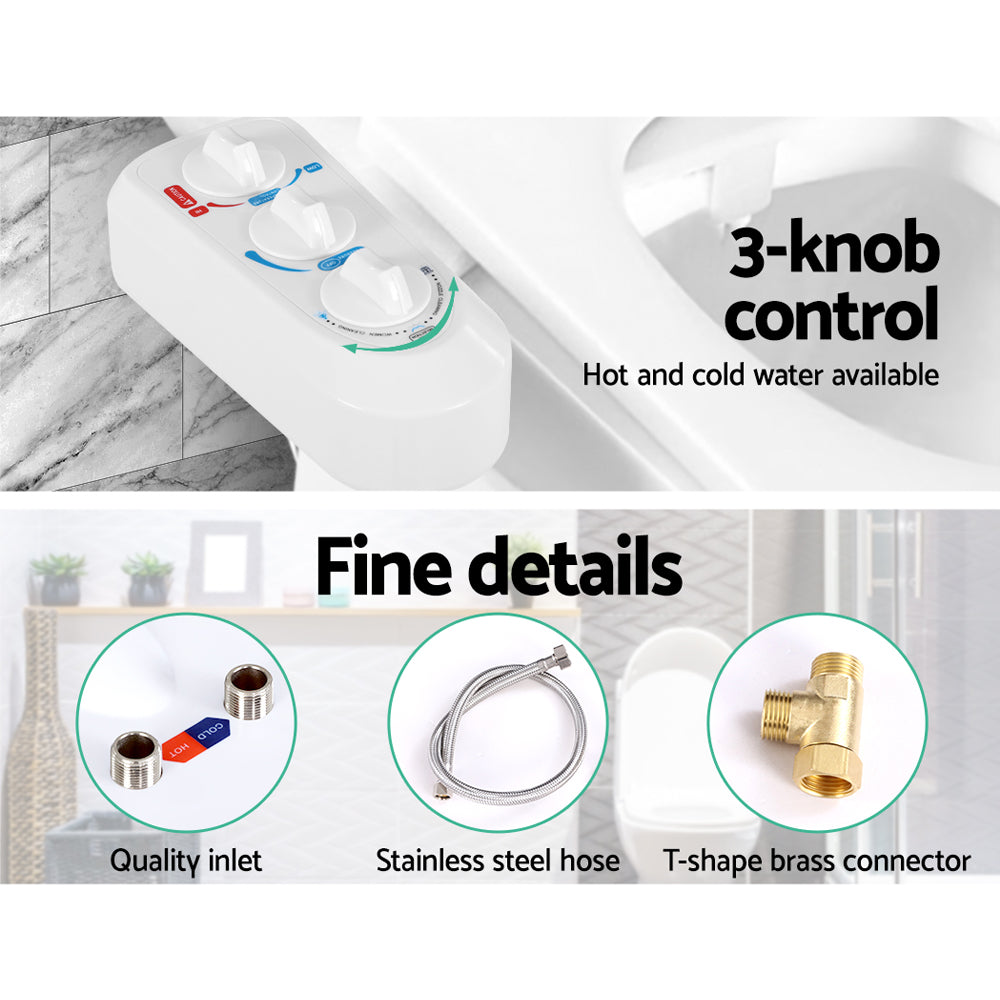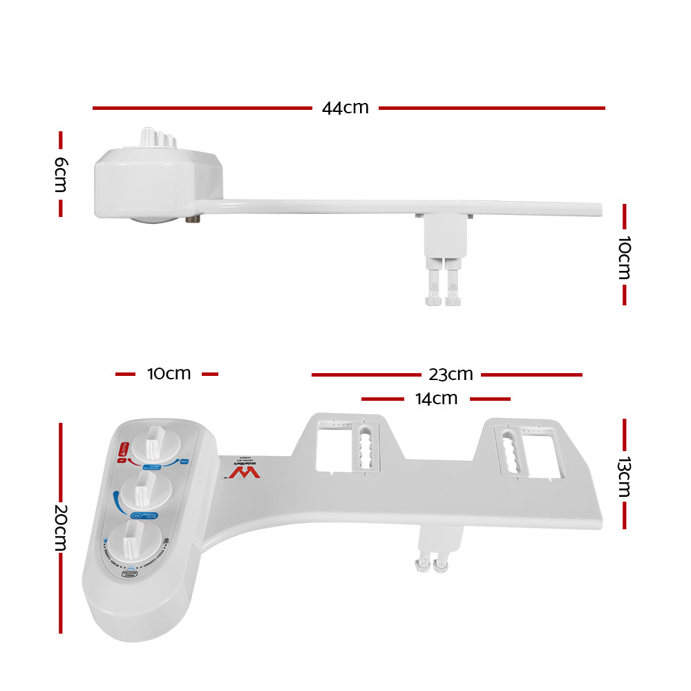 Just as you need water to wash your face, hair, hands, feet and other parts of your body to keep clean and healthy, the same holds true for your personal areas. And if cleanliness and hygiene are important to you, then you will find our Non-electric Bidet an integral part in ensuring a refreshing lifestyle. Perfect for mums with young kids who need proper cleaning, carers for the elderly and disabled, dealing with issues such as haemorrhoids and constipation or simply for better hygiene, the non-electric bidet is a convenient solution to address all your needs. The bidet fits any Australian standard-sized toilet and is easy to install. Simply mount on top of existing toilet seat, with no need to remove and replace it. Connect to the water supply with the supplied fittings and you are good to go. The dual-nozzle bidet is easy to operate with its rotary control and has two washing modes (posterior and feminine), adjustable water temperature and adjustable water pressure to suit all your washing needs. So begin a fresh approach to personal hygiene with the exceptionally safe and reliable non-electric bidet.