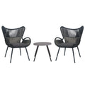 This beautiful armchair set is designed especially for outdoor spaces. Crafted in a classic Scandinavian style, the set consists of 2pcs armchairs and a round coffee table. The set material is weather-proof, water-repellent, and stain resistant. The coffee table has polycement tabletop in dark grey and steel leg in Sandblack colour. Non-porous tabletop treated to resist staining. The structure frame of the armchair is made of steel ED coating before powder coating and weather-resistant polyester rope in black. Grey cushions add beauty to the armchair. The chair is upholstered in polyester fabric. The easy-to-assemble set is highly durable. It comes with a 1-year warranty. The set is suitable for small to medium outdoor areas with minimum area requirements of 207cm x 79 cm.