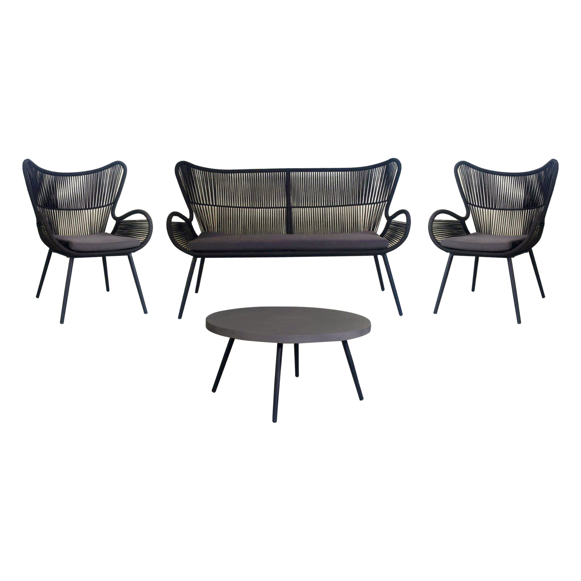 This beautiful sofa set is designed especially for outdoor spaces. Crafted in a classic Scandinavian style, the set consists of 1pc 2-seater sofa, 2pcs armchairs and a side table. The set material is weather-proof, water-repellent, and stain resistant. The table has polycement tabletop in dark grey and steel leg in Sandblack colour. Non-porous tabletop treated to resist staining. The structure frame of the sofa and armchair is made of steel ED coating before powder coating and weather-resistant polyester rope in black. Grey cushions add beauty to the armchair. The chair and sofa are upholstered in polyester fabric. The easy-to-assemble set is highly durable. This sofa set comes with a 1-year warranty. The set is suitable for small to medium outdoor areas with minimum area requirements of 207cm x 79 cm.