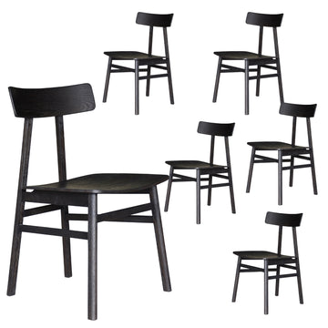 This lovely 6-piece dining chair set with timber seat fills your dining space with comfort and sophistication. It is designed in the Industrial style. It stands out in any decor setting due to its wooden construction and unique back design. The chairs are made of sustainably harvested solid oak wood, with a sandblasted finish in classic black colour. The wood gives the chairs strength and durability. The chairs have a one-of-a-kind appearance, with beautifully designed legs. The fully assembled dining chairs come with a one-year warranty.