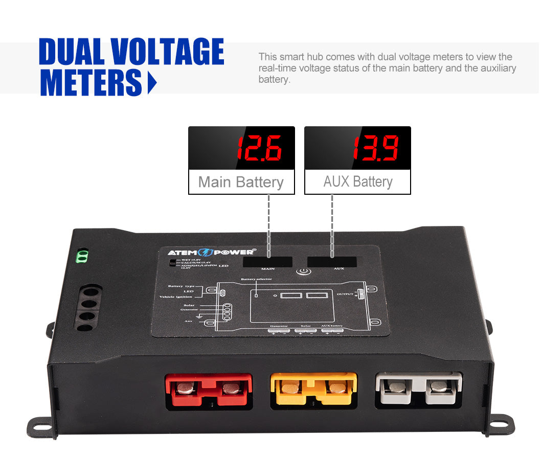 Dual Voltage Meters: This smart hub comes with dual voltage meters to view the real-time voltage status of the main battery and the auxiliary battery.