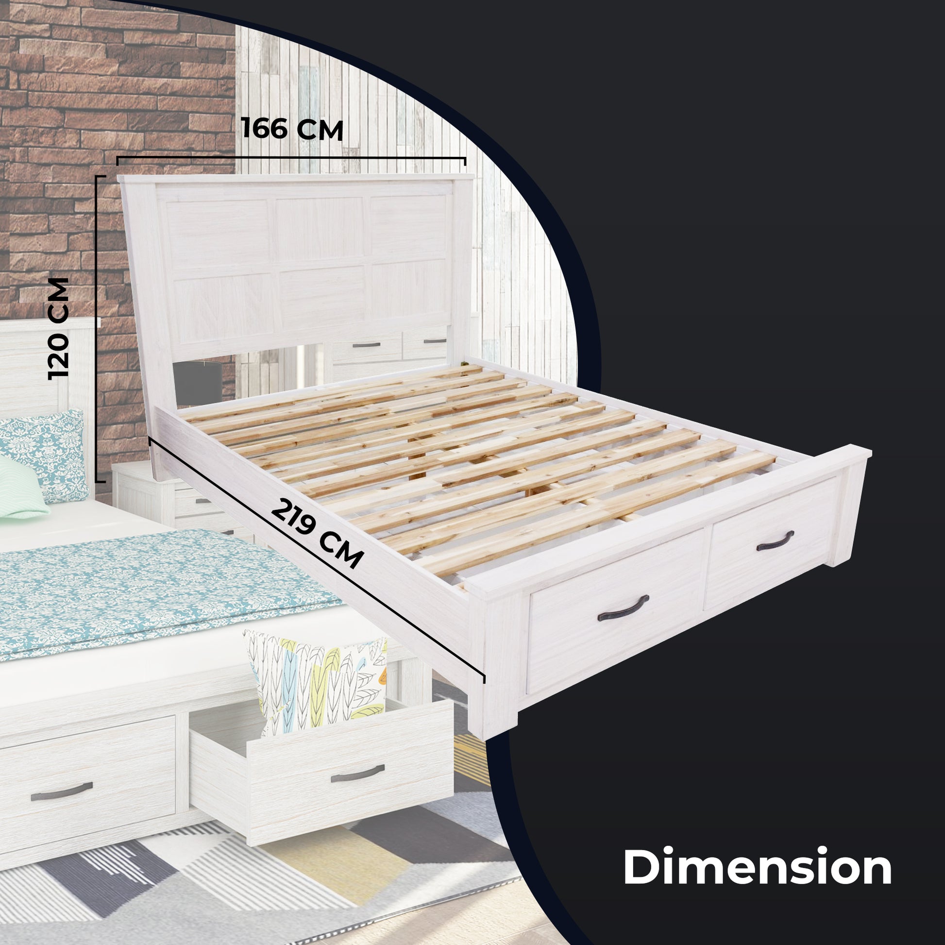 A bedroom is the place that gives the most comforting rest. Enjoy a restful night's sleep here with this queen bed with storage, designed in the coastal style. The bed transforms your bedroom into a luxurious retreat where you can unwind in a relaxed manner. The magnificent furniture piece is made of mountain ash wood harvested in a sustainable way. The wood is known for attractive looks, great strength, shock-resistance, durability, and also easy maintenance. A distinctive panelled 'checker-board' headboard gives a classy look to the bed, and a solid wood slat system with central support legs gives it super robustness. The easy-to-assemble bed comes with 2 storage drawers to enhance the storage capacity of your bedroom. That means you can easily keep your bedroom clutter-free. The drawers are embellished with smooth metal extension runners and gleaming metal handles with an antiqued finish. The bed in Brushed White Wash finish goes well with a variety of interior decor styles. A one-year warranty is included with it.