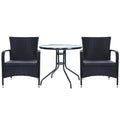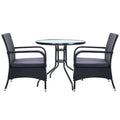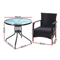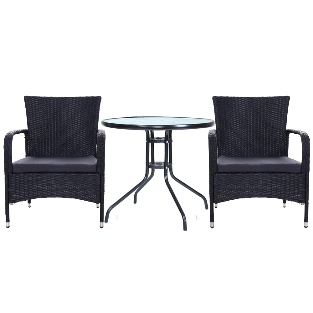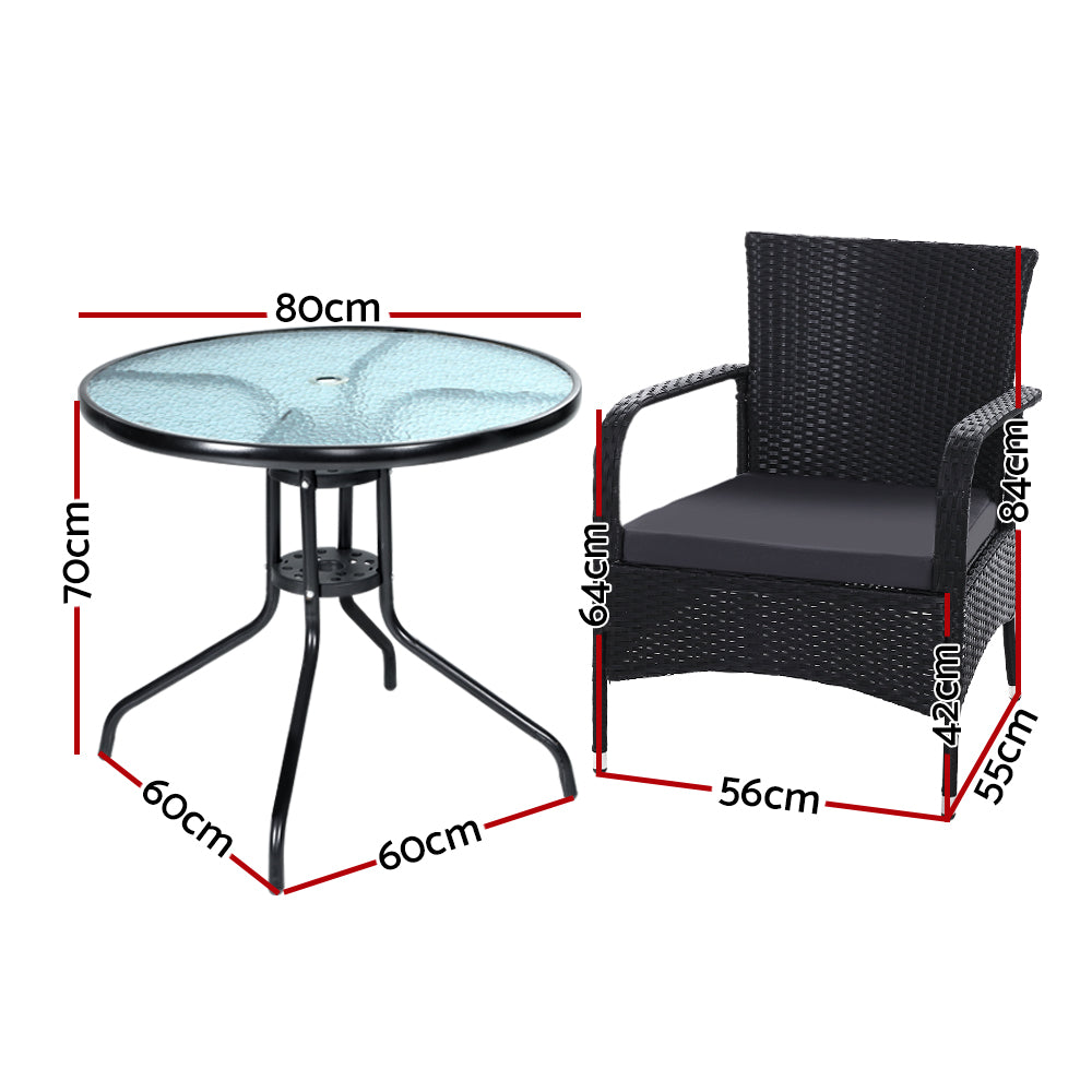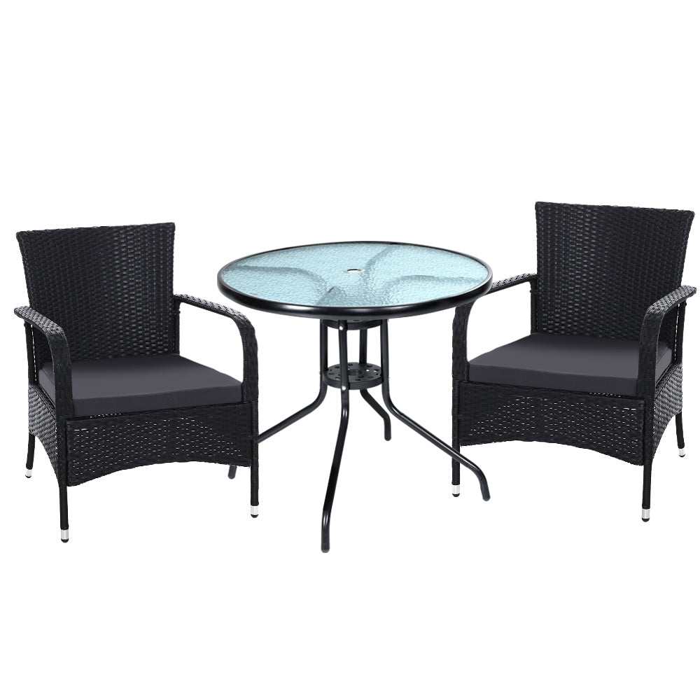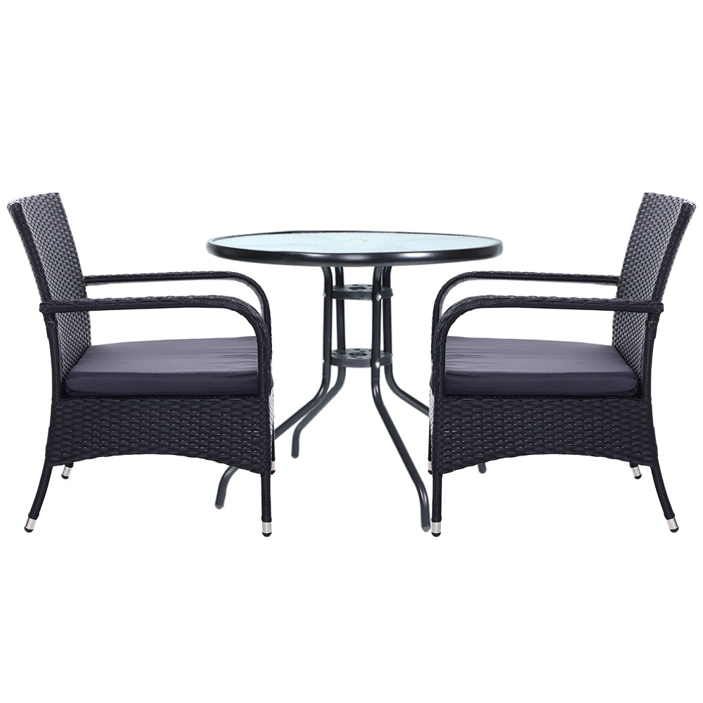 Enjoy the pleasant outdoors or have a nice chat with friends over a cuppa with our Gardeon Outdoor Bistro Set. With its chic and trendy profile, the set comes with a glass-top table and two wicker chairs. The elegant table is stunning in looks and equally as functional. The thick steel frame makes it durable and the 5mm thick tempered ripple glass does not only look stylish, it is easy to clean. Plus, there is a built-in hole for your parasol for you to relax outdoors for as long as you like during the hot summers without the fear of getting sunburnt. The chair is finished in meticulously weaved UV-resistant and weather-resistant PE wicker with a strong and sturdy steel frame construction. The exotic design, spacious seating and 5cm thick high-density foam cushions ensure comfort and style are always in place. Best of all, the removable and washable seat cushion cover makes cleaning up hassle-free. Together, the set is designed to please as well as stand up to the weather elements and the non-slip feet make the set suitable for use in even the most slippery of situations. With so much going for it, the bistro set certainly deserves its coveted space in your lovely backyard, deck or patio. Or even indoors for a unique presence.