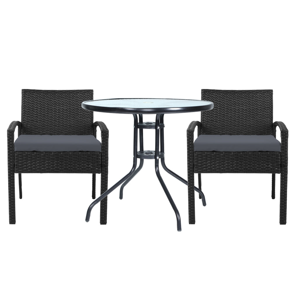 Enjoy the pleasant outdoors or have a nice chat with friends over a cuppa with our Gardeon Outdoor Bistro Set. With its chic and trendy profile, the set comes with a glass-top table and two wicker chairs. The elegant table is stunning in looks and equally as functional. The thick steel frame makes it durable and the 5mm thick tempered ripple glass does not only look stylish, it is easy to clean. Plus, there is a built-in hole for your parasol for you to relax outdoors for as long as you like during the hot summers without the fear of getting sunburnt. The chair is finished in meticulously weaved UV-resistant and weather-resistant PE wicker with a strong and sturdy steel frame construction. The exotic design, spacious seating and 5cm thick high-density foam cushions ensure comfort and style are always in place. Best of all, the removable and washable seat cushion cover makes cleaning up hassle-free. Together, the set is designed to please as well as stand up to the weather elements and the non-slip feet make the set suitable for use in even the most slippery of situations. With so much going for it, the bistro set certainly deserves its coveted space in your lovely backyard, deck or patio. Or even indoors for a unique presence.