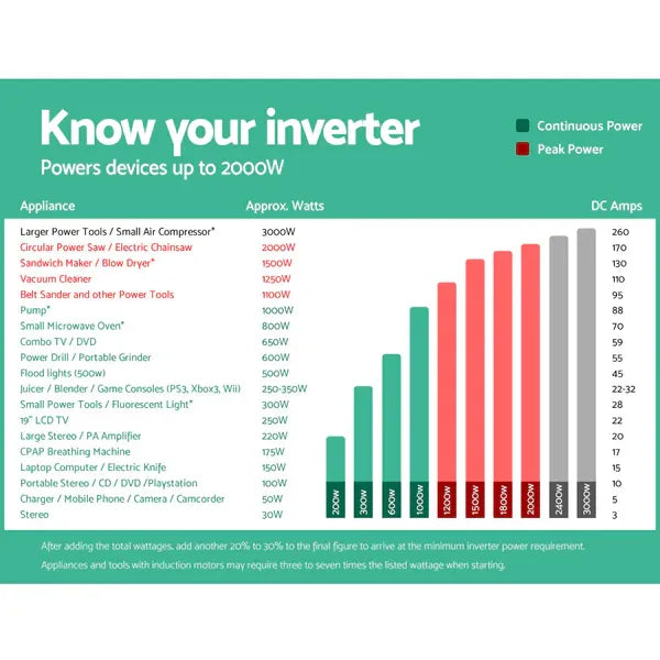 Compatible with any 12V battery, the Wave Inverter uses reliable Japanese engineering capacitance and incorporates the latest IGBT inverter technology for a remarkable 90% high efficiency rate. It has a continuous output of 1000W and peaking at 2000W. It also has a convenient USB output and dual 240V sockets. Not least, the Inverter meets Australian specifications and has overloading, over-voltage and overheating protection.