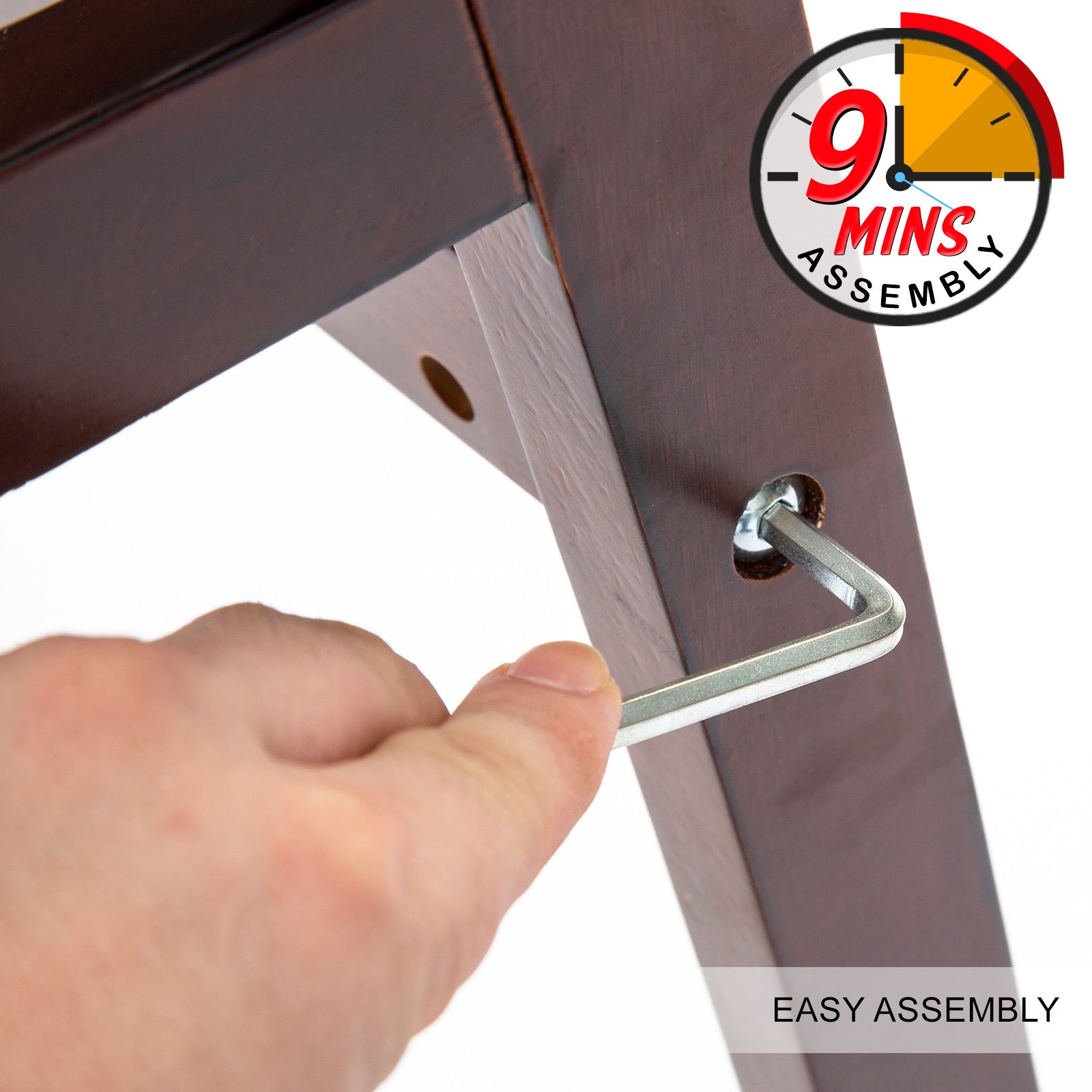 To ensure safety, the legs are tapered outwards to form a slight A-shape, so that the bar stool is well-balanced without occupying too much space. Additionally, the legs are made of solid rubberwood with a footrest to ensure extra sturdiness and support. This does not mean comfort is sacrificed as the seat itself is upholstered with PU leather. Stool legs are also equipped with anti-slip protectors to minimise scratches onto wooden and tile floors. To give you a peace of mind, the bar stool will only take you approximately 9 minutes to assemble.