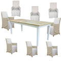 This beautiful dining set gives your living room the perfection it deserves. Both the table and chairs are exceptional in their own ways. Designed beautifully, the multi-coloured table features a lightly stained natural timber tabletop, contrasted with white painted legs. The two-tone range looks gorgeous in a variety of interior decor styles. Designed by using the elements of a combination of styles, including Hampton, Coastal, Modern Farmhouse, and French Provincial, the dining table exudes perfection effortlessly. The 8-seater dining table has robust, tapered legs. It is made of sustainably harvested, solid mango wood using traditional construction techniques that ensure perfect cuts and an impeccable shape to suit your taste. The wood makes the table strong and durable while providing water and heat resistance. The dining table is complemented with the beautiful chairs, which feature a simple, functional, substantial design that includes a loose cover with perfect cuts and comfy armrests. The chairs have legs made of rubber wood, giving maximum strength to the chair frame. With a wide seat and a wide backrest, the chair offers maximum relaxation and back support. The chair, in a lovely Beige colour, is made of sustainably harvested solid pine and MDF, and it is upholstered in 100% polyester linen. The easy-to-assemble dining table comes with a one-year warranty, and the fully-assembled chairs come with a two-year warranty.