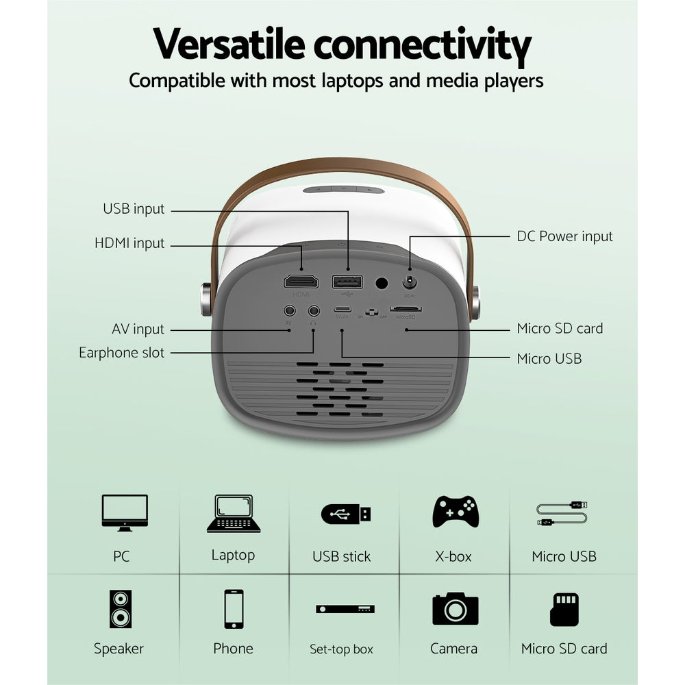 From the small screen to the big screen, now you can enjoy epic entertainment with our Devanti Video Projector. With its ultra-expansive colour gamut, the projector delivers crisp clear images with more brilliant colours to give you the best projection experience. The projector is compatible up to 1080p, so you won't have to compromise on quality. Using Wi-Fi connectivity, our video projector effortlessly supports screen casting from your iPhone, iPad, smartphone, tablet or laptop, So you can stream content cable free. It also features a built-in heavy bass speaker and a high-lumens lamp with a lifespan of up to 30,000 hours. For even more entertainment value, the projector includes HDMI, USB, AV and 3.5mm audio ports for fast connection to multiple devices such as external speakers, game consoles and hard disks. Get the home cinema experience and order today! Include remote control and additional AV audio cable.