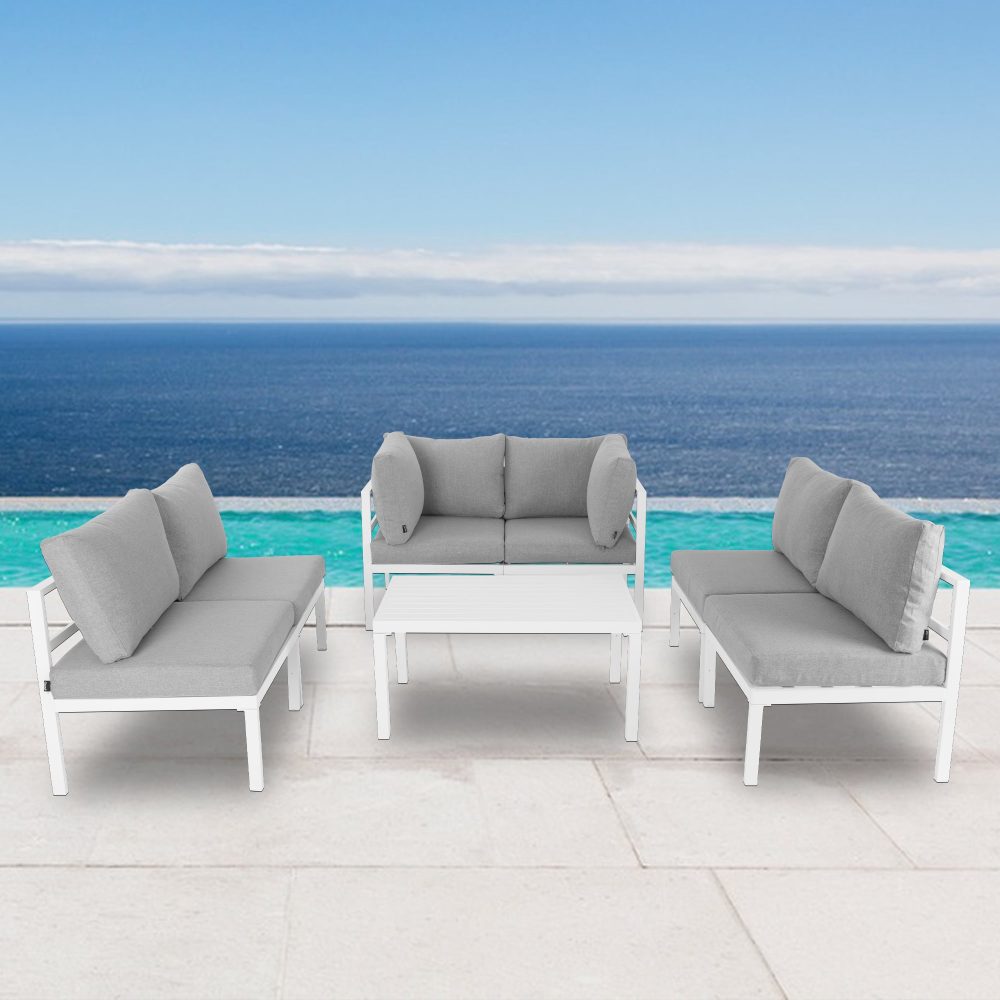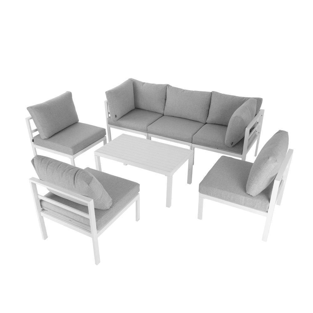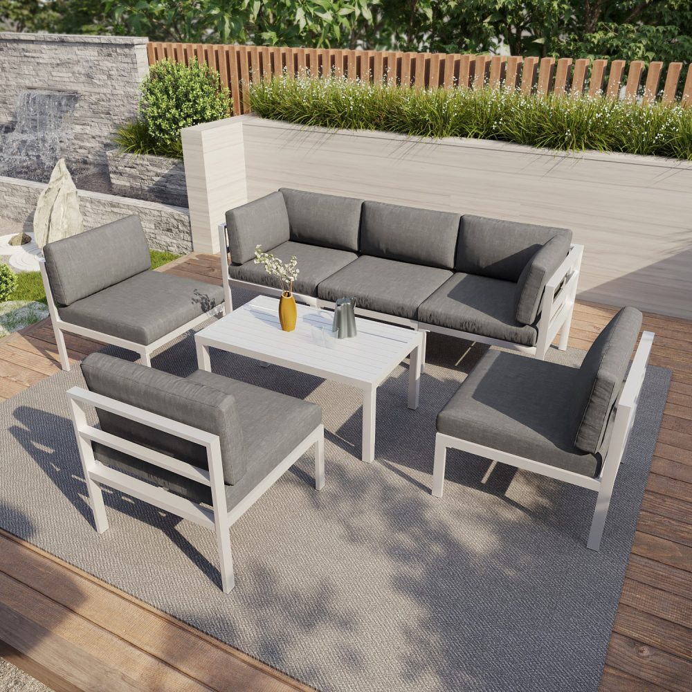 Want a beautiful and comfortable outdoor leisure suit that can rest at any time? This 7-piece set is made of aluminum material. On a solid basis, each seat is equipped with comfortable cushion and pillow to provide you with extreme comfort. In addition, a fade resistant lining is used for easy cleaning. Just open the zipper of the machine washable cushion cover and quickly clean it to make it look new. This set of outdoor furniture adopts modular design. No matter what configuration you like, you can combine its modular components into different configurations, and you can arrange them at will! Moreover, aluminum products can be weatherproof, and the overall structure is light and convenient to move. It is very suitable for outdoor terraces, gardens, swimming pools and other places, with a full atmosphere.