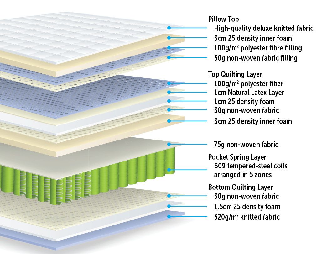 The springs of conventional mattresses function as a single unit; by contrast, pocket springs are independent and are activated separately. With 609 tempered-steel coils and a medium firmness, the pocket spring design provides customized comfort according to body weight, shape, and contours. And that's not all: 5 distinct Zones offer proper support, truly restful sleep is your reward.