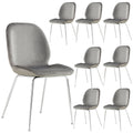 This set of 8-piece dining chairs makes your dining area look beautiful. Designed in the Scandinavian style, the chairs are upholstered in Roma velvet fabric and have strong, tapered, metal chrome legs. A soft back makes them even more comfortable, giving them a unique look. The chairs look stunning in all decor settings, thanks to their inviting shape and grey-coloured fabric upholstery. A metal frame gives them great strength. A one-year warranty is included with the fully assembled chairs.