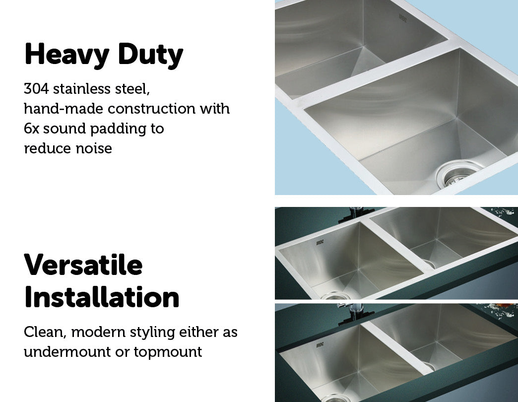 This double sink is made from hand-made 1.2mm-thick Type 304 stainless steel for a brilliant look that will last and last. It measures 770 x 450 x 190mm (L x W x D) with a 90mm drain opening. Two strainer wastes are included. Installation is either drop-in or Undermount / Topmount-style. Undermount / Topmount brackets are included along with full installation instructions.