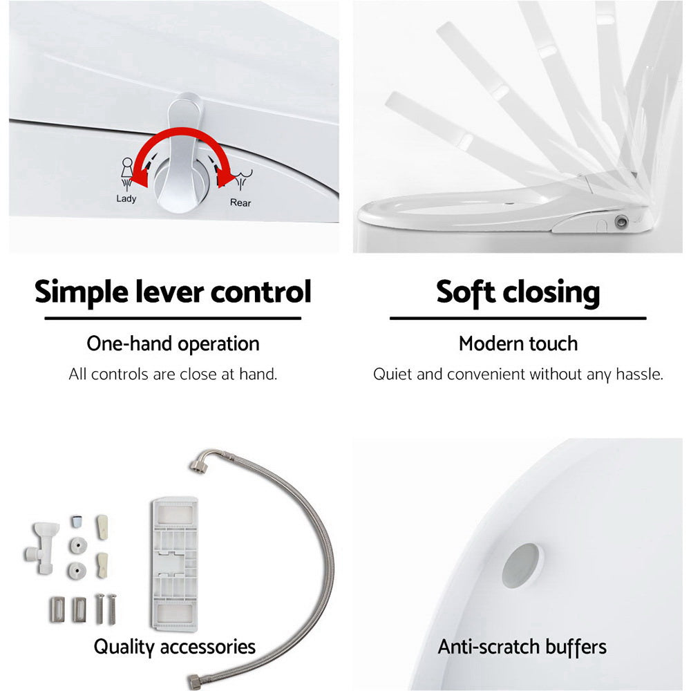 Coming in a D-shape design, the bidet seat easily matches up with any Australian standard-sized toilet seat. Simply remove and replace. Connect to the water cistern supply with the supplied fittings and you are good to go. No plumbers or electricians needed. The bidet has two retractable nozzles, one for posterior wash and one for feminine wash, and adjustable water pressure that you can easily control using the side lever. Not least, with its self-cleaning nozzles, you are assured of hygienic use all the time. So begin a fresh approach to personal hygiene with our exceptionally safe and reliable non-electric bidet.